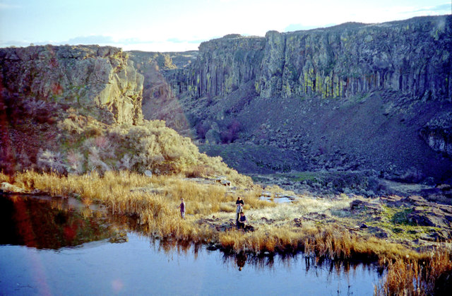 Fishing in Small Lake above Ancient LakeIf you climb up the waterfall at the head of the coulee, you find yourself in another small coulee with this small lake. We tried the fishing without much luck. A few trout were caught in the large lake by some of the boys, including one "lunker". |