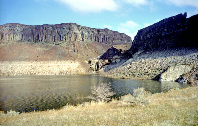 Basalt Bluffs Tower over the Ancient LakesThe Ancient Lakes are a number of small lakes at the head of a coulee draining into the Columbia. The lakes were formed when during the last ice age, the waters of huge lakes dammed by ice from the continental ice sheet were unleased onto the Columbia Plateau when the ice dams repeatedly broke. These tremendous floods poured over the walls at the head of the coulee where a huge twin waterfall dug out the lakes at the base of the cliffs. |