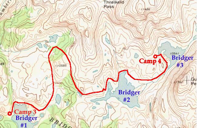 We were planning to camp at Lower Jean Lake for our fourth night which meant a long day of cross country travel up and over Elbow ridge and a long descent on the other side. We were also hoping to do a little fishing in the upper Bridger lakes along the way.