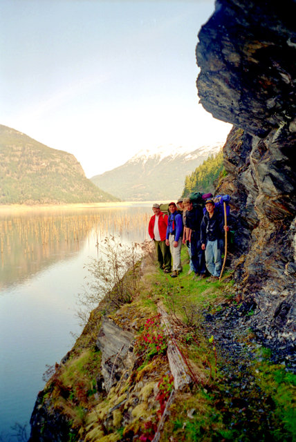 East Bank Ross Lake TrailIn some places the trail is literally blasted out of the face of a cliff, as shown in the above picture. In late summer, the water level is just a few feet below the trail, but in early spring the trail is not for the faint hearted as it is a sheer drop from the edge of the trail to the lake far, far below. |