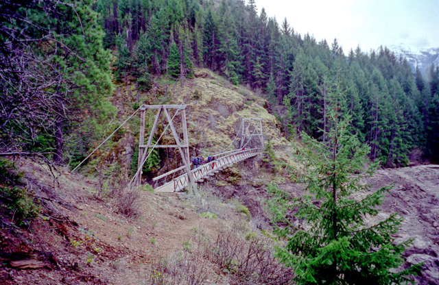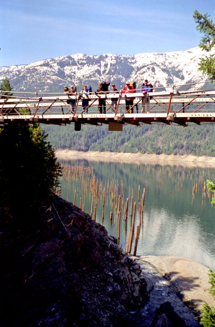 Bridge over Devil's CreekThe Ross Lake Mini-Miler was a four day, three night backpacking trip up and back the East Bank Trail along Ross Lake in the North Cascades National Park. Normally, the highway is gated four miles from the trailhead, but a light snowpack and a mild winter led to the early opening of the highway so that we could do this trail in early April. In late summer, the water under this bridge would be about 15 feet below this bridge. All winter long, the water level in the lake is lowered in anticipation of the runoff from the spring and summer snow melt. So in April, it's about 90 to 100 feet to the bottom of the canyon. They have signs saying "No Jumping" which seem a little funny but are really intended for when the lake is full. |